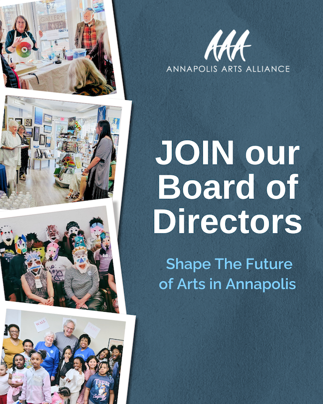 The Annapolis Arts Alliance is looking for passionate advocates and community builders to join our Board of Directors. Through programs like Art Buddies, Gallery 57 West, and artist scholarships, we’re making creativity accessible to everyone in Annapolis, and we’re just getting started.